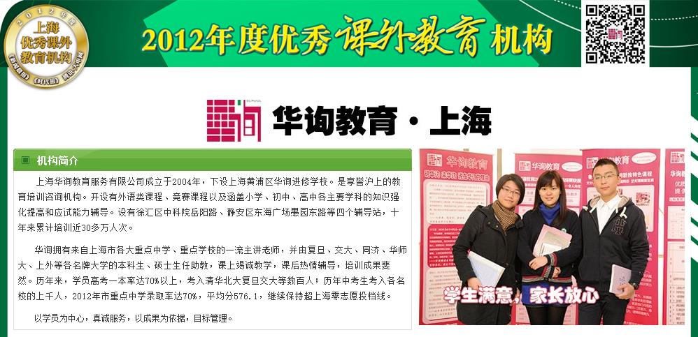 華詢教育被《新聞晨報》《時代報》《騰訊·大申網(wǎng)》聯(lián)合評為2012年度上海優(yōu)秀課外輔導(dǎo)機(jī)構(gòu)