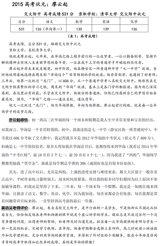2015高考華詢狀元廖云起531分錄取清華大學(xué)