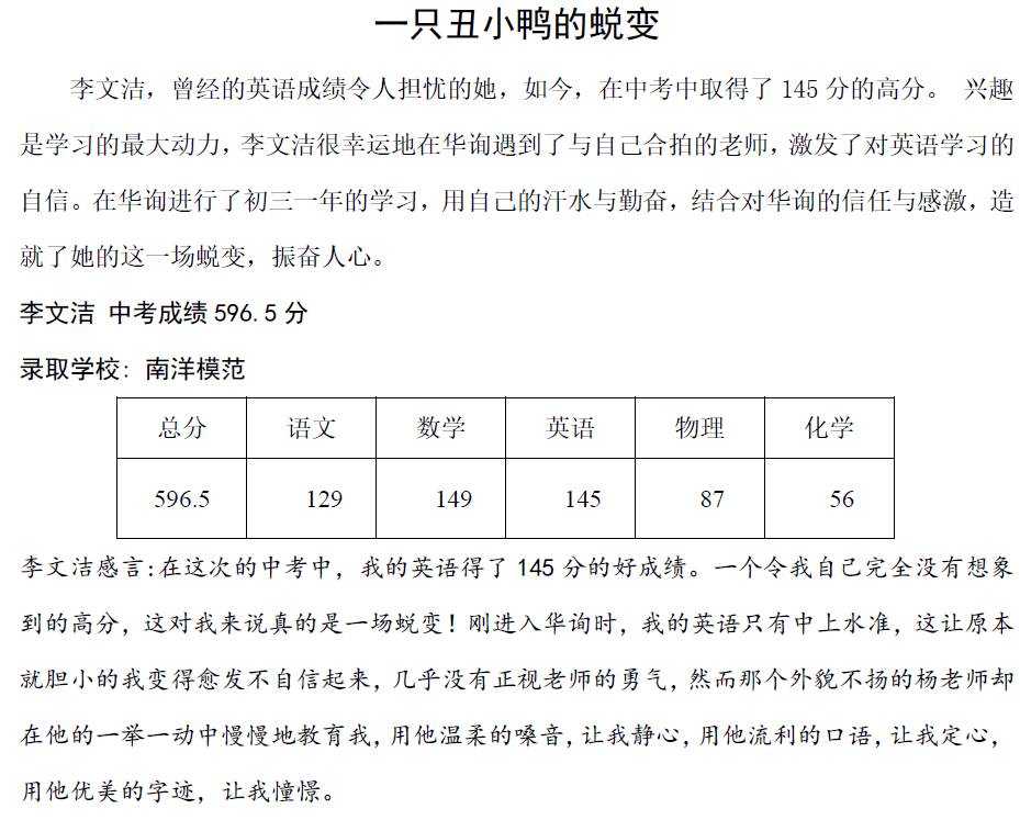 李文潔中考成績(jī)596.5分錄取學(xué)校: 南洋模范